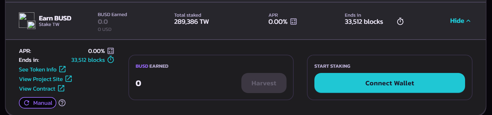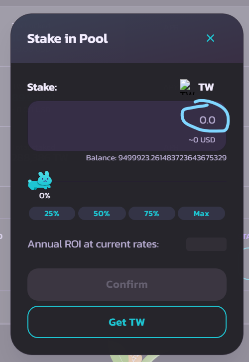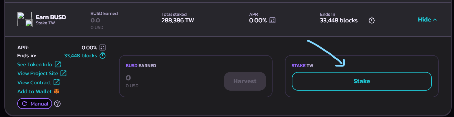 Enter the amount of TW you want to stake then click confirm and approve in your wallet. After you give permission in your wallet. you will see the number of tokens and rewards you get in the stake and harvest column&#x20;